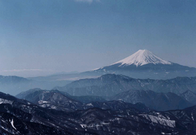 笹子峠、御坂山系の向こうに雄大な富士山