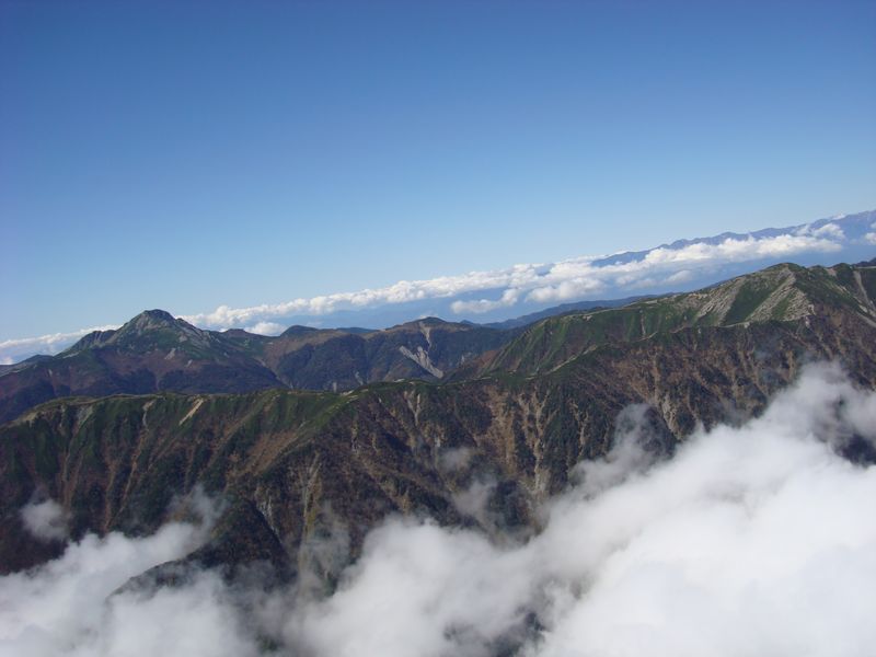 農鳥岳9,928フィート(約2,978m)、間ノ岳10,463フィート(約3,139m)左後方に塩見岳9,997フィート(約2,999m)