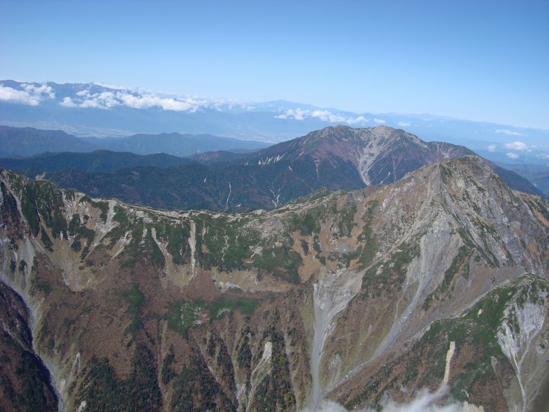 北岳10,473フィート(約3,142m)、後方に仙丈ケ岳9,951フィート(約2,985m)、左手前の間ノ岳との稜線に山小屋が見えます