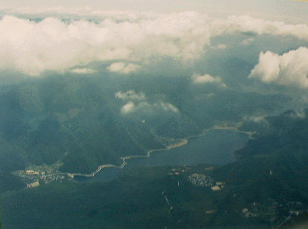 1997年7月、富士五湖は、湖水の水量が激減、水量が減った西湖を上空から望む。